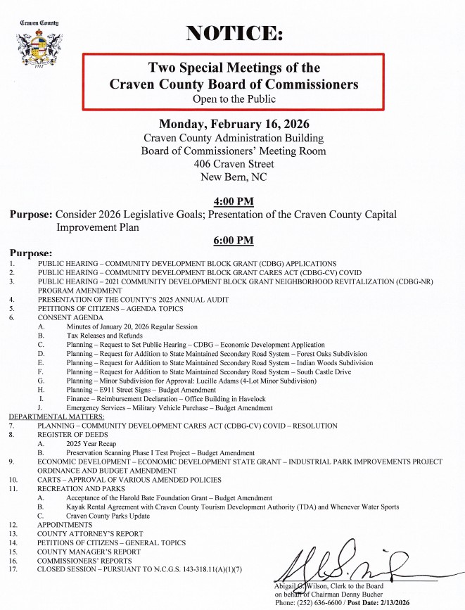 Craven County Board of Commissioners' 2026 Meeting Schedule